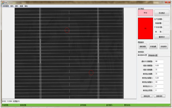 對(duì)太陽(yáng)能電池片的正銀印刷缺陷在線監(jiān)測(cè),可按需調(diào)節(jié)監(jiān)測(cè)參數(shù),將不影響效率和分級(jí)的缺陷忽略;對(duì)不同缺陷等級(jí)進(jìn)行不同處理方式(告警、停機(jī)處理等)。